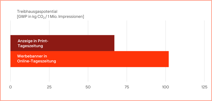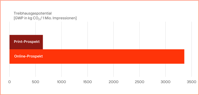 Bezogen auf eine Millionen Impressionen haben gedruckte Werbeprospekte mit 642 kg CO₂-Emissionen einen fünfmal geringeren Fußabdruck als Online-Prospekte im PDF-Format. Bei Anzeigen in Tageszeitungen ist der Unterschied zwar geringer, doch auch hier weißt die gedruckte Variante einen Umweltvorteil auf: Print-Anzeigen verursachen nur 67 kg CO₂, Online-Werbebanner hingegen 102 kg CO₂.